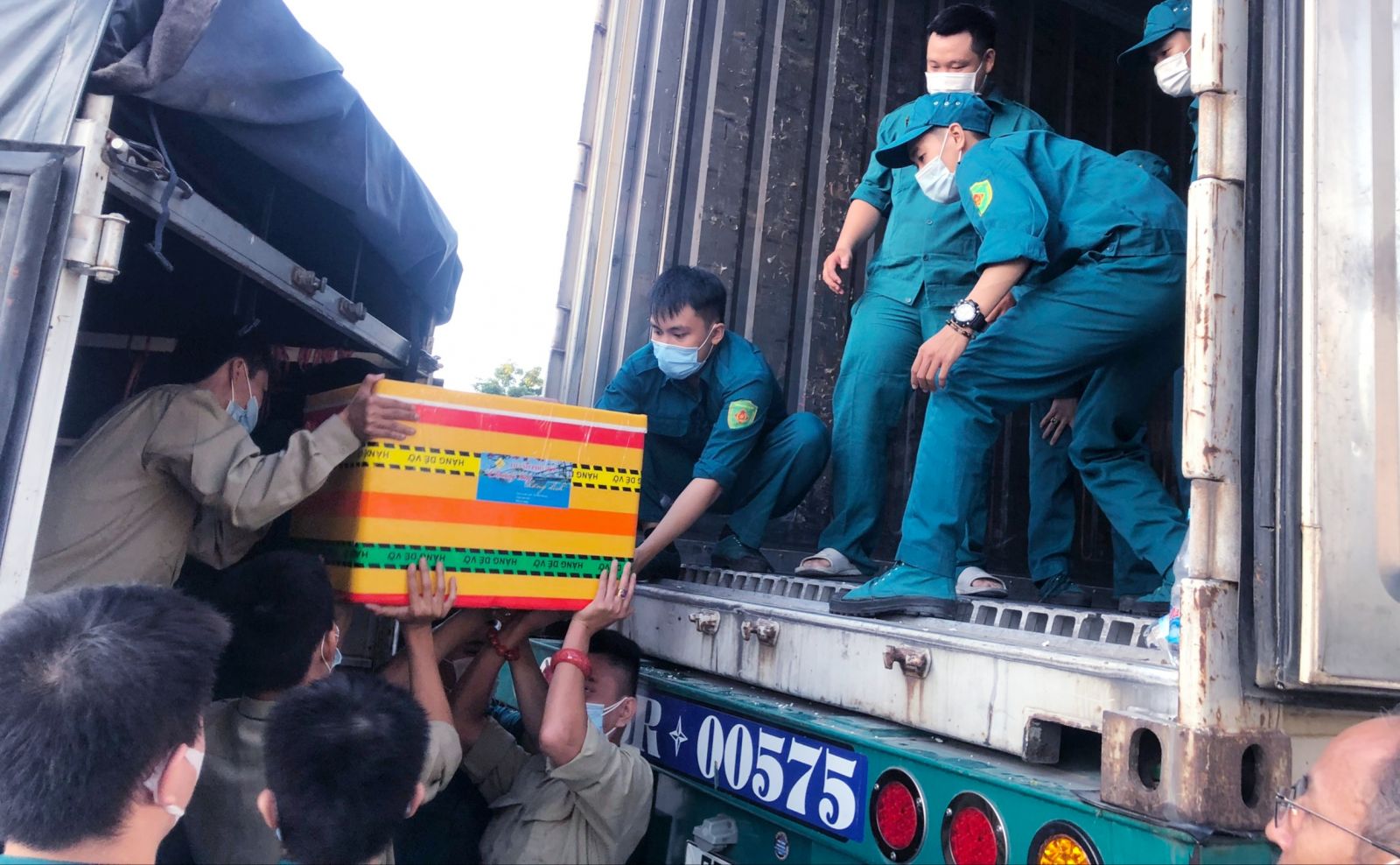 Lực lượng dân quân các phường, xã bốc vác thực phẩm vận chuyển vào TP. Hồ Chí Minh ủng hộ đồng bào ảnh hưởng bởi dịch COVID- 19