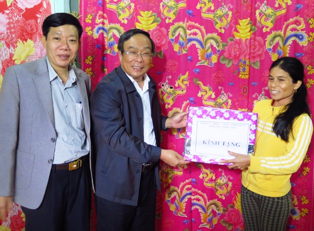 | Chủ tịch UBND tỉnh Nguyễn Văn Cao (giữa) cùng ông Hà Văn Tuấn trao quà Tết cho hộ thoát nghèo tiêu biểu tại xã Thượng Nhật, Nam Đông |