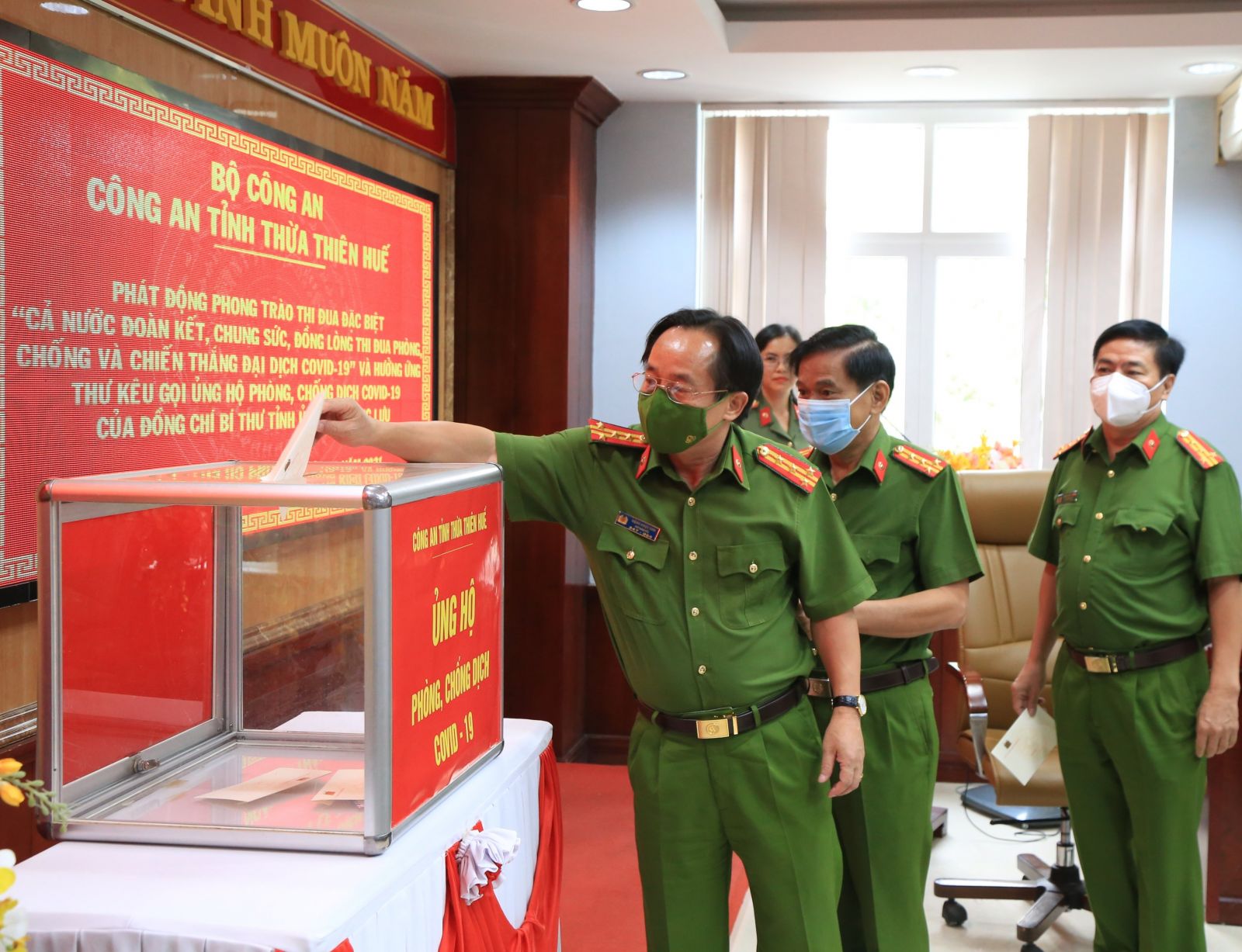 * Chiều 26/8, Công an tỉnh phát động hưởng ứng phong trào thi đua đặc biệt của Thủ tướng Chính phủ “Cả nước đoàn kết, chung sức, đồng lòng, thi đua phòng, chống và chiến thắng đại dịch COVID -19” và Thư kêu gọi của UVTW Đảng, Bí thư Tỉnh ủy, Chủ tịch HĐND tỉnh, Trưởng Đoàn ĐBQH tỉnh Lê Trường Lưu về việc ủng hộ bà con đồng hương tỉnh Thừa Thiên Huế và các tỉnh, thành khu vực phía Nam gặp khó khăn do dịch COVID - 19.
