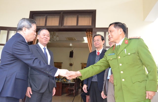 Nguyên Phó Bí thư Thường trực Tỉnh ủy Nguyễn Văn Cường (trái) cảm động trước sự đón tiếp của lãnh đạo TX. Hương Thủy tại buổi gặp mặt