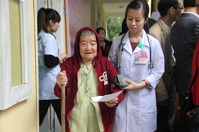 Thành viên đoàn khám bệnh dẫn các bệnh nhân lớn tuổi đến các phòng khám