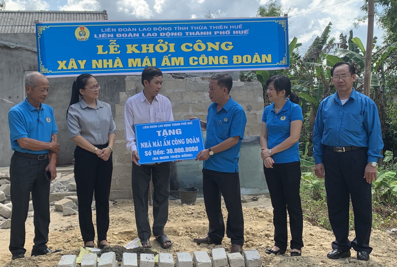 Từ nguồn Quỹ “Mái ấm Công đoàn” của LĐLĐ tỉnh, LĐLĐ thành phố đã trao 30 triệu đồng góp một phần kinh phí hỗ trợ anh Cử xây mới nhà thay cho nơi ở đã xuống cấp trước đây tại xã Quảng Phú, huyện Quảng Điền. Căn nhà rộng 60m2 với tổng kinh phí gần 200 triệu đồng dự kiến sẽ được hoàn thành trong tháng 8 năm nay.