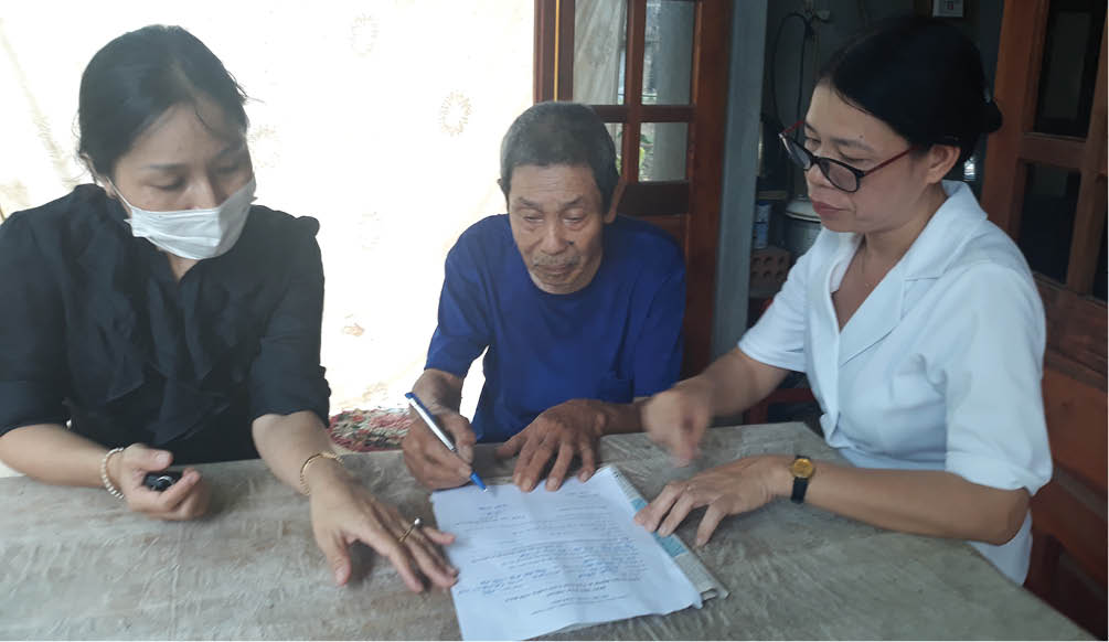 Cán bộ xã Phú Mậu đến tận nhà thực hiện chi trả cho đối tượng nghèo cao tuổi, bệnh tật