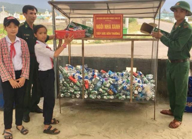Chính trị viên phó chia sẻ: Tuy lực lượng biên phòng đã và đang thực hiện nhiều chương trình, hành động để “nâng bước em đến trường”, thế nhưng vẫn còn không ít học sinh nghèo thiếu thốn sách vở, đồ dùng học tập, thiếu những bộ quần áo mới. Chỉ một thoáng buồn trong ánh mắt trẻ thơ cũng khiến anh và đồng đội day dứt. Nỗi day dứt hối thúc anh làm điều gì đó, bù đắp cho các cháu. “Trên địa bàn Đồn Biên phòng Lăng Cô quản lý có rất nhiều nhà hàng ven biển hàng ngày đón lượng khách lớn đến ăn uống. Số lượng vỏ lon bia, nước ngọt, chai nước suối thải ra cũng rất nhiều. Tại sao không vận động chủ nhà hàng hỗ trợ nguồn vỏ lon, chung tay cùng BĐBP làm một việc có ý nghĩa, gây quỹ tặng quà cho học sinh nghèo. Mang suy nghĩ đó “tỉ tê”, chúng tôi được nhiều chủ nhà hàng hưởng ứng, đồng ý. Mừng lắm. Anh em trong đơn vị lập tức bắt tay dùng nhôm, sắt cũ, tự cắt, hàn, làm “Ngôi nhà xanh”, mang đến khu vực các nhà hàng, gom vỏ chai, vỏ lon. Hàng ngày sẽ có những người thu mua phế liệu đến thu mua”- Thiếu tá Dũng nhớ lại. Anh hào hứng “bật mí”, khi biết ý nghĩa của quỹ “Ngôi nhà xanh”, không những các chủ nhà hàng ven biển trên địa bàn thị trấn Lăng Cô, mà Công ty Biển Xanh kinh doanh dịch vụ du lịch, nhà hàng ăn uống tại Đảo Ngọc cũng sẵn lòng “để dành” vỏ chai, lon các loại chờ các anh gom vào đất liền gây quỹ. “Ngôi nhà xanh” của đồn đã “vượt biển” ra đảo, “đứng” bên bờ biển, phía trước Trạm Kiểm soát Sơn Chà.