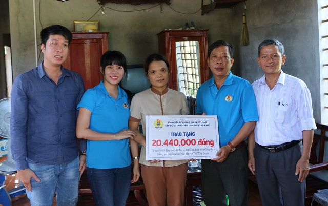 HNN.VN - Sáng 5/7, Liên đoàn Lao động (LĐLĐ) tỉnh tổ chức thăm hỏi, động viên và trao kinh phí hỗ trợ cho đoàn viên Nguyễn Thị Mộng Quyên thuộc công đoàn cơ sở (CĐCS) Công ty CP Thanh Tân tại nhà riêng ở phường Thủy Phương (thị xã Hương Thủy).