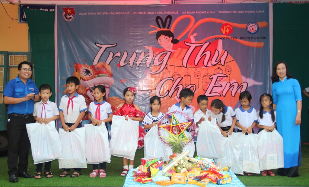 Tại chương trình, 427 em học sinh Trường tiểu học Phong Xuân đều được nhận các phần quà trung thu với kẹo, bánh trung thu và đèn ông sao.