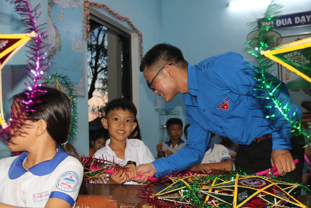 Đại diện chi đoàn Báo Thừa Thiên Huế tặng đèn ông sao cho các học sinh