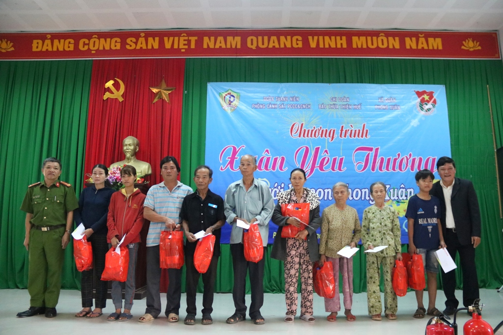 Đại diện Đảng ủy Báo Thừa Thiên Huế cùng Phòng Cảnh sát phòng cháy chữa cháy và cứu nạn, cứu hộ Công an tỉnh tặng quà cho các hộ dân