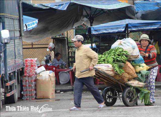 Tại ngôi chợ được xem là “dạ dày” của TP. Huế và các vùng lân cận này có gần 100 lao động tự do, phần lớn là những người hành nghề bốc vác đến từ các phường Phú Hiệp, Phú Hậu, Phú Bình… Chị Trần Thị Hồng, hành nghề bốc vác, chia sẻ: “Chợ ni có khoảng 60 người bốc vác, 70% trong số đó là phụ nữ. Còn lại là các bác xích lô, xe thồ. Mặc dù mấy hôm ni trời mưa lạnh, nhưng ai cũng cần tiền trang trải cho những ngày tết sắp đến nên phải chịu khó làm việc gấp đôi so với ngày thường”.