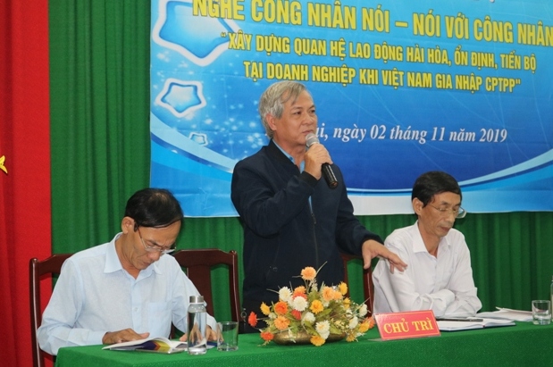 Ông Trần Hữu Cáo, Chủ tịch Công đoàn Khu Kinh tế, công nghiệp tỉnh trao đổi với công nhân về những vấn đề được quan tâm