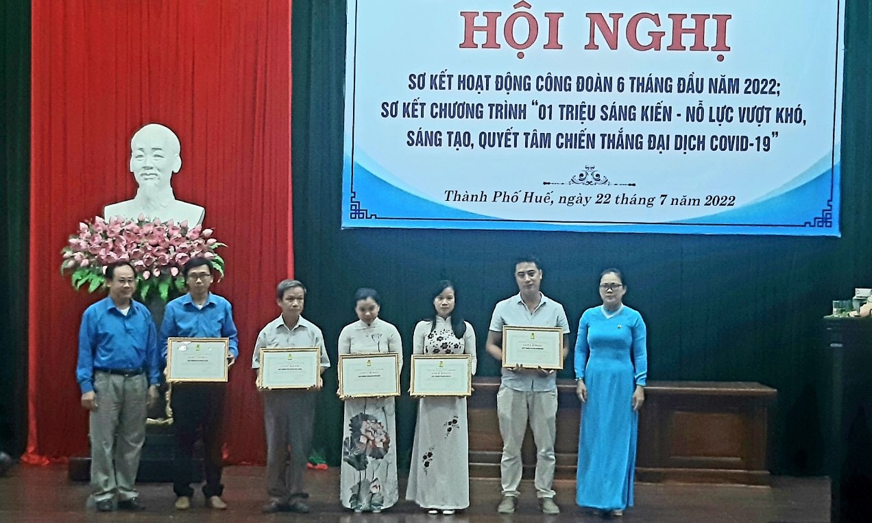Dịp này, LĐLĐ TP. Huế khen thưởng 5 tập thể có thành tích trong thực hiện phong trào sáng kiến - nỗ lực vượt khó, sáng tạo, quyết tâm chiến thắng đại dịch COVID-19.