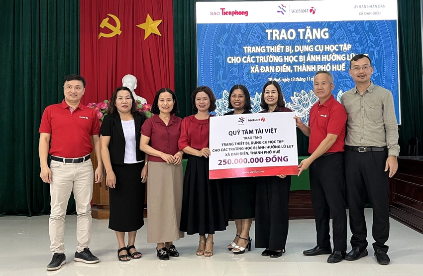 Báo Tiền Phong, Công ty TNHH MTV Xổ số điện toán Việt Nam (Vietlott) phối hợp cùng Ủy ban MTTQ Việt Nam thành phố tổ chức trao tặng nhiều phần quà thiết thực đến các trường học, người dân chịu ảnh hưởng nặng nề bởi mưa lũ tại xã Đan Điền.
