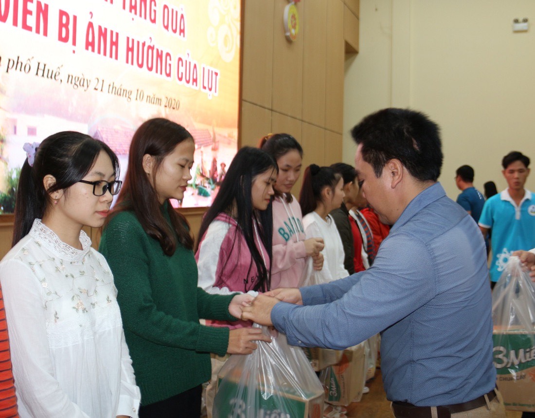 * Sáng 21/10, Trường ĐH Kinh tế, ĐH Huế phối hợp với Cộng đồng Khởi nghiệp Huế đã trao 200 suất quà đến sinh viên có hoàn cảnh khó khăn, chịu nhiều ảnh hưởng do mưa lũ.