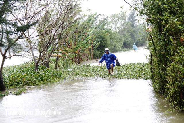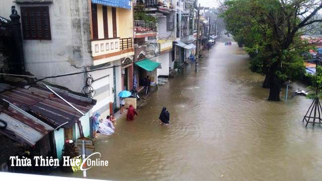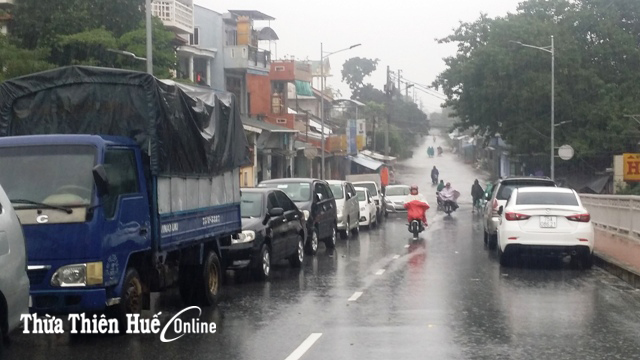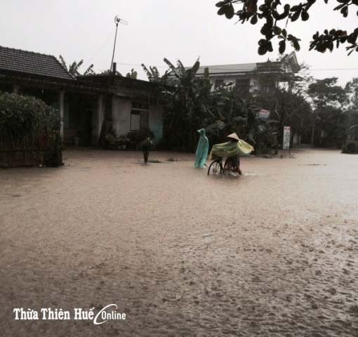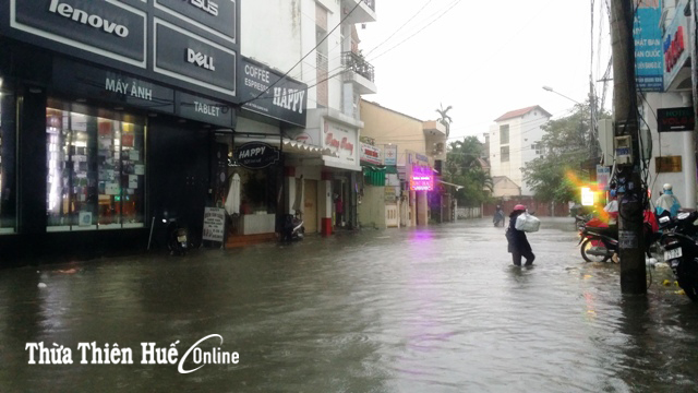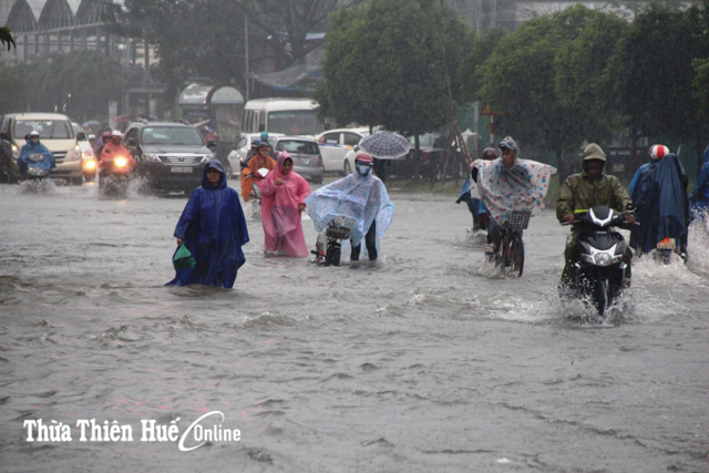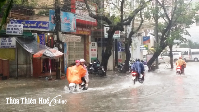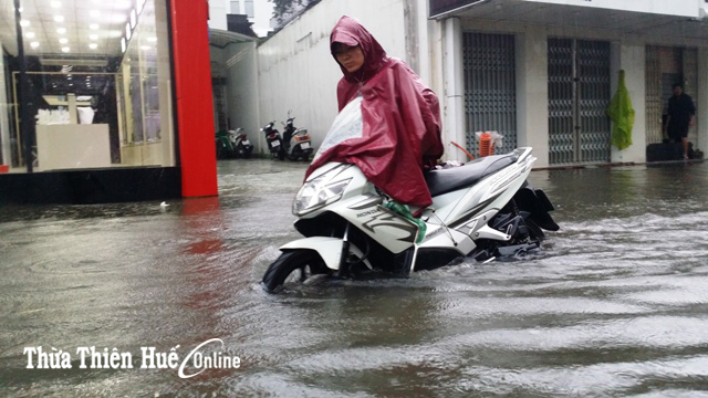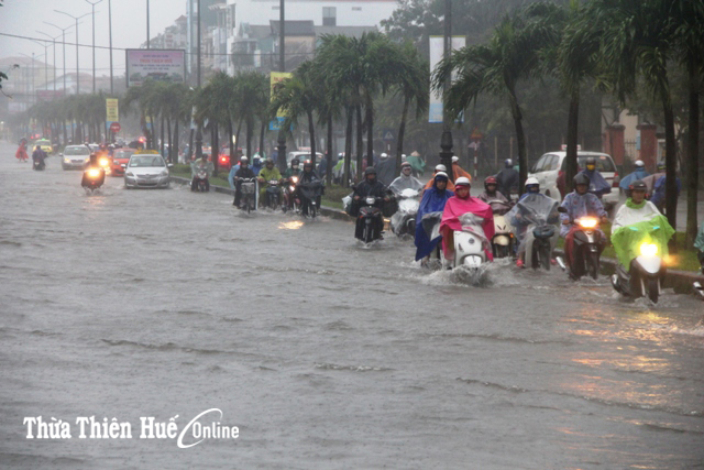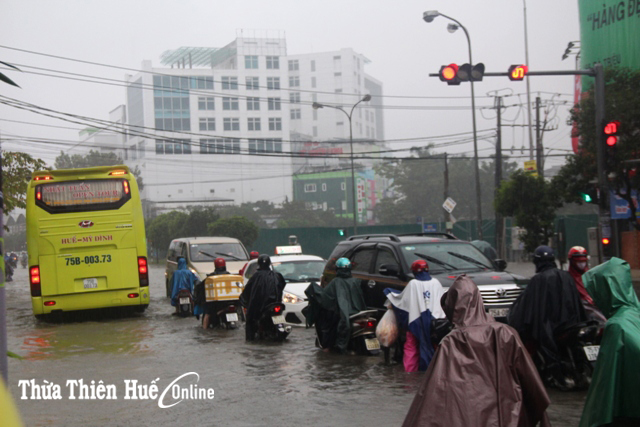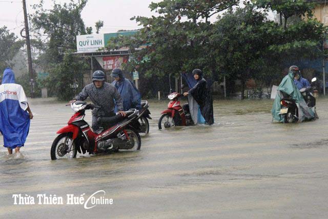 Tại TP Huế, mưa lớn gây ngập từ 0,3-0,5cm các tuyến đường nội thị như, Vạn Xuân, Chi Lăng, Nguyễn Chí Thanh, Hùng Vương, Tôn Đức Thắng, Dương Văn An, Trường Chinh, Nguyễn Lộ Trạch… Trong chiều nay, việc đi lại của người dân hết sức khó khăn