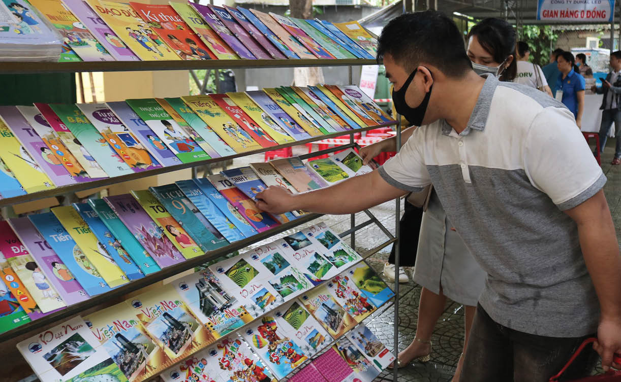 Gian hàng sách giáo khoa tại "Phiên chợ 0 đồng" được đông đảo đoàn viên, người lao động quan tâm