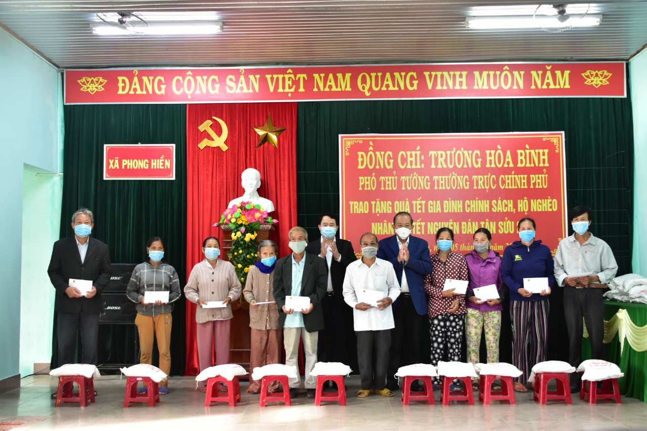 Trong chuyến thăm, chúc Tết tại tỉnh Thừa Thiên Huế, Phó Thủ tướng Thường trực Chính phủ Trương Hòa Bình tặng 200 suất quà Tết cho các gia đình chính sách, hộ nghèo của xã Phong Hiền, huyện Phong Điền, giúp bà con đón một mùa xuân mới ấm áp, vui tươi.