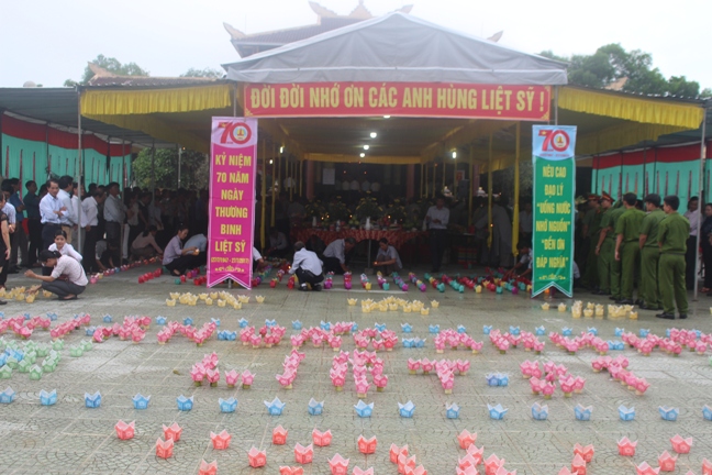 Trong không khí trang nghiêm và thành kính, lãnh đạo huyện, các cơ quan, ban, ngành, đoàn thể cấp huyện và 11 xã, thị trấn... tiến hành dâng hoa, dâng hương, cầu siêu tưởng niệm các anh hùng liệt sĩ, cầu nguyện cho anh linh của 1.926 liệt sĩ trên địa bàn huyện đã hy sinh vì sự nghiệp giải phóng dân tộc, vì sự bình yên của đất nước hôm nay và các Mẹ Việt Nam Anh hùng đã khuất. Tại đại lễ cầu siêu, hàng nghìn ngọn nến được các phật tử, nhân dân trên địa bàn huyện dâng lên các phần mộ liệt sĩ thể hiện lòng tri ân, “uống nước nhớ nguồn”.