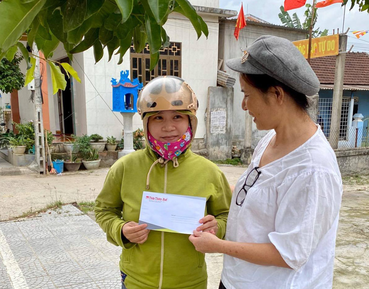 Đại diện Báo Thừa Thiên Huế (bên phải) trao phần quà đến chị Phan Thị Sáu