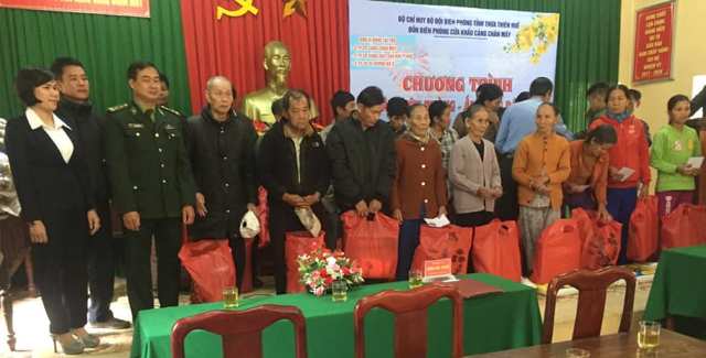 HNN.VN - Ngày 29/1, tại Đồn biên phòng cửa khẩu cảng Chân Mây, Trung tá Trần Văn Tuyển, Chủ nhiệm chính trị Bộ Chỉ huy Bộ đội biên phòng tỉnh trao 27 suất quà trị giá hơn 12 triệu đồng cho các hộ nghèo xã Lộc Vĩnh, huyện Phú Lộc.