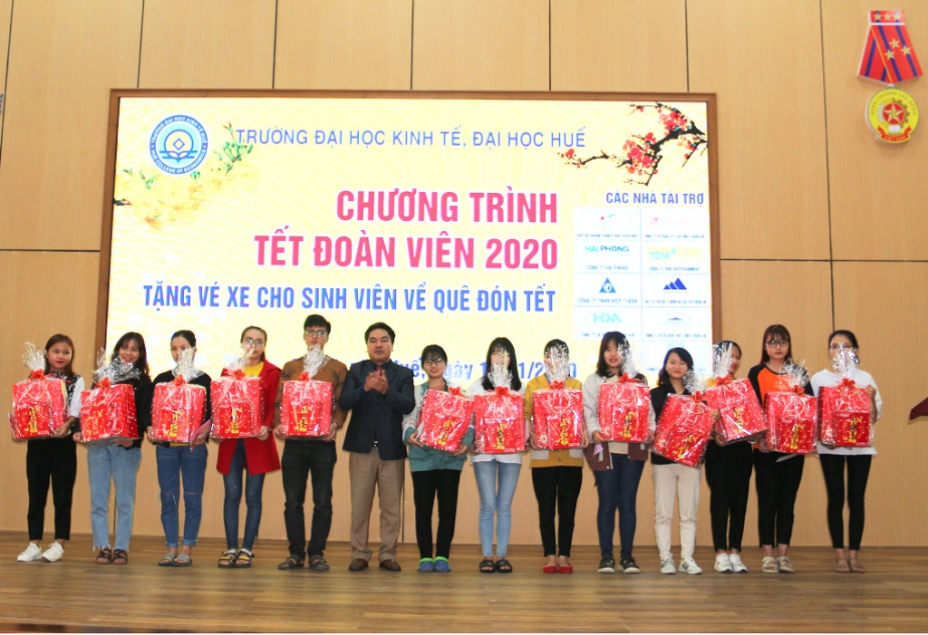 Năm nay, Trường ĐH Kinh tế trao 14 phần quà cho những sinh viên có hoàn cảnh đặc biệt khó khăn và tặng vé xe cho 223 sinh viên ở 16 tỉnh, thành trên cả nước đang học tập tại trường, chủ yếu ở các tỉnh miền Trung và Tây Nguyên. Mỗi vé xe có giá trị từ 200.000 – 800.000 đồng, tùy theo lộ trình đi của từng sinh viên.