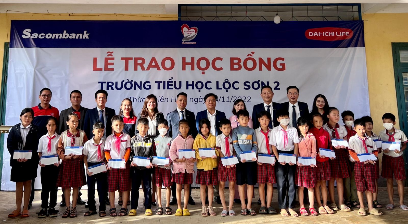 HNN.VN - Ngày 14/11, Ngân hàng Sacombank phối hợp với Công ty Bảo hiểm nhân thọ Dai-ichi Life Việt Nam tổ chức trao tặng 50 suất học bổng, mỗi suất 1 triệu đồng, cho 50 em học sinh hoàn cảnh khó khăn và có thành tích cao trong học tập tại Trường Tiểu học Lộc Sơn 2, huyện Phú Lộc.