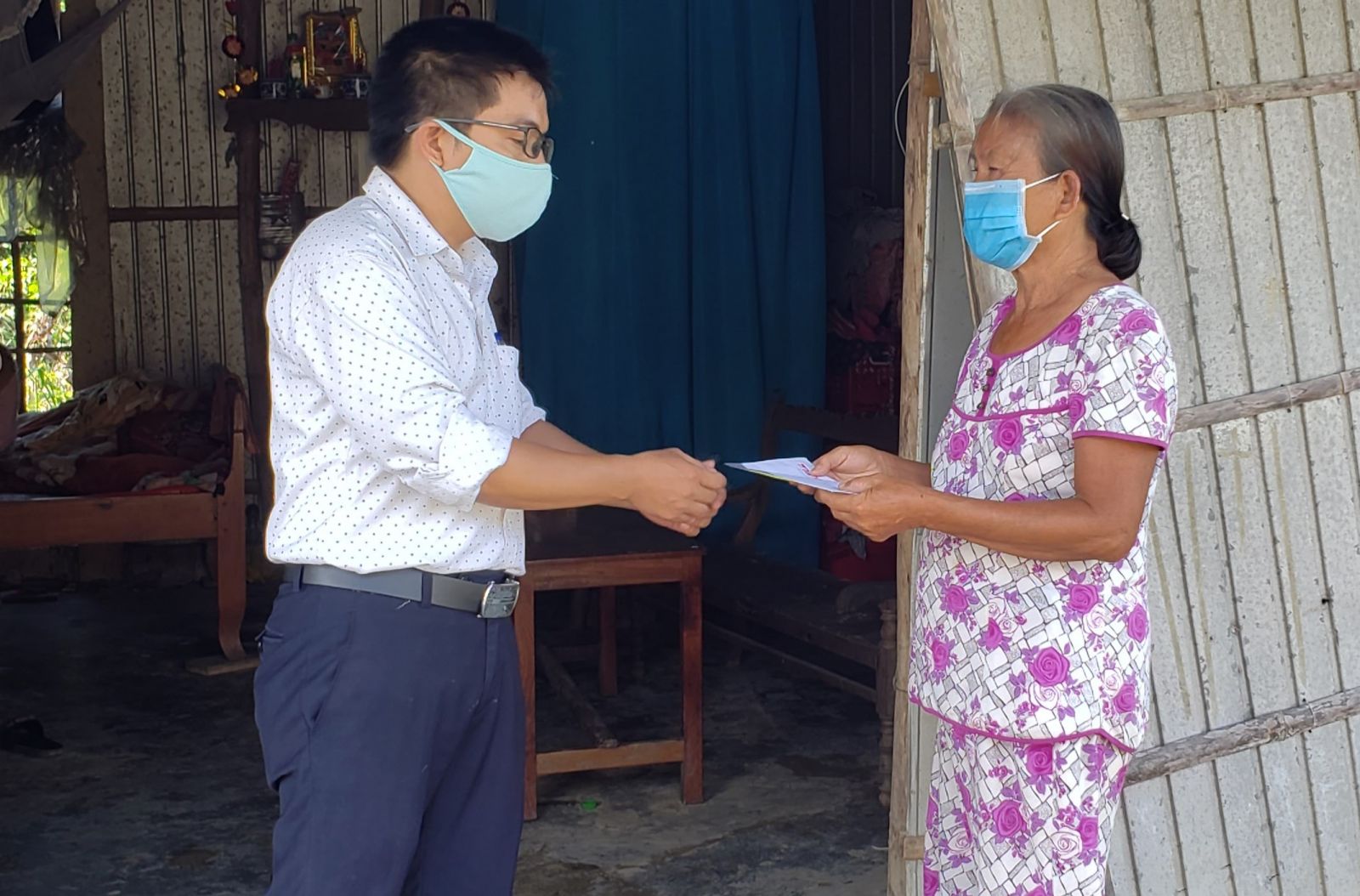 Trao 2,5 triệu đồng cho gia đình anh Nguyễn Ngái (bên phải là mẹ anh Nguyễn Ngái)