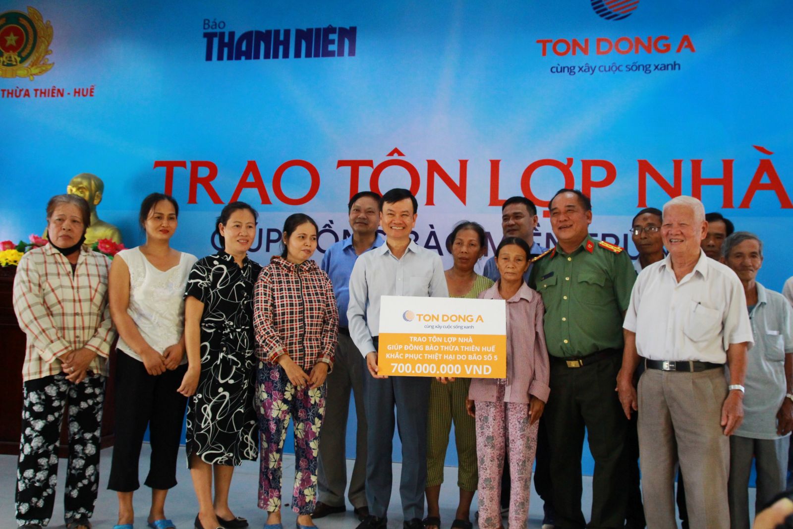 Theo đó, các đơn vị và Công ty CP Tôn Đông Á đã trao hàng ngàn mét tôn cho 126 hộ gia đình khó khăn bị thiệt hại nặng do cơn bão số 5 gây ra ở các phường, xã: Thủy Châu, Thủy Vân (TX. Hương Thủy); Phú Dương, Phú Xuân (Phú Vang); Điền Hòa, Điền Lộc (Phong Điền)…; và trao hàng trăm mét tôn lợp nhà cho 2 trường học trên địa bàn tỉnh. Tổng kinh phí cho hoạt động này là 700 triệu đồng.