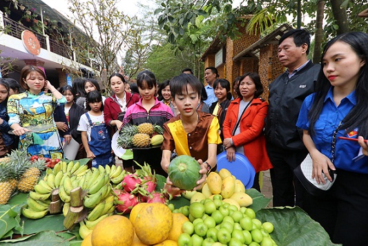 Trẻ em các trung tâm bảo trợ chọn trái cây trang trí mâm ngũ quả tại ngày hội "Nắng ấm mùa xuân"