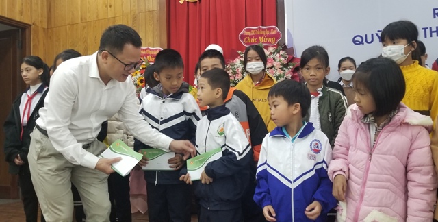 Đại diện lãnh đạo tổ chức Zhi-Shan trao quà cho học sinh nghèo vượt khó