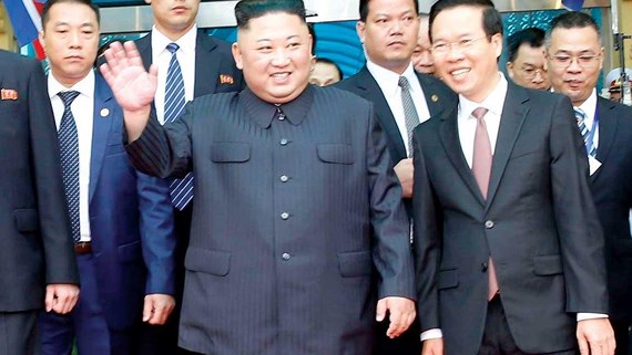 Chủ tịch Triều Tiên Kim Jong-un vẫy tay chào người dân tỉnh Lạng Sơn ra đón đoàn tại ga Đồng Đăng vào sáng 26/2. Ảnh: TTXVN