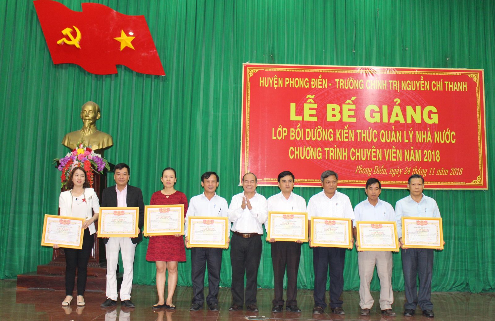 HNN.VN - Ngày 24/11, Trường Chính trị Nguyễn Chí Thanh phối hợp với UBND huyện Phong Điền tổ chức Bế giảng lớp Bồi dưỡng kiến thức Quản lý nhà nước chương trình chuyên viên năm 2018 cho 110 học viên là cán bộ công chức, viên chức của các cơ quan, ban, ngành, các xã, thị trấn trên địa bàn huyện Phong Điền. Dự lễ bế giảng có ông Nguyễn Thiên, TUV, Hiệu trưởng Trường chính trị Nguyễn Chí Thanh.
