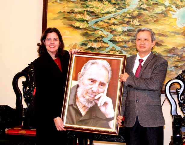 Bà Lianys Torres Rivera tặng Bí thư Tỉnh ủy Lê Trường Lưu và Tỉnh ủy bức chân dung cố Chủ tịch Fidel Castro