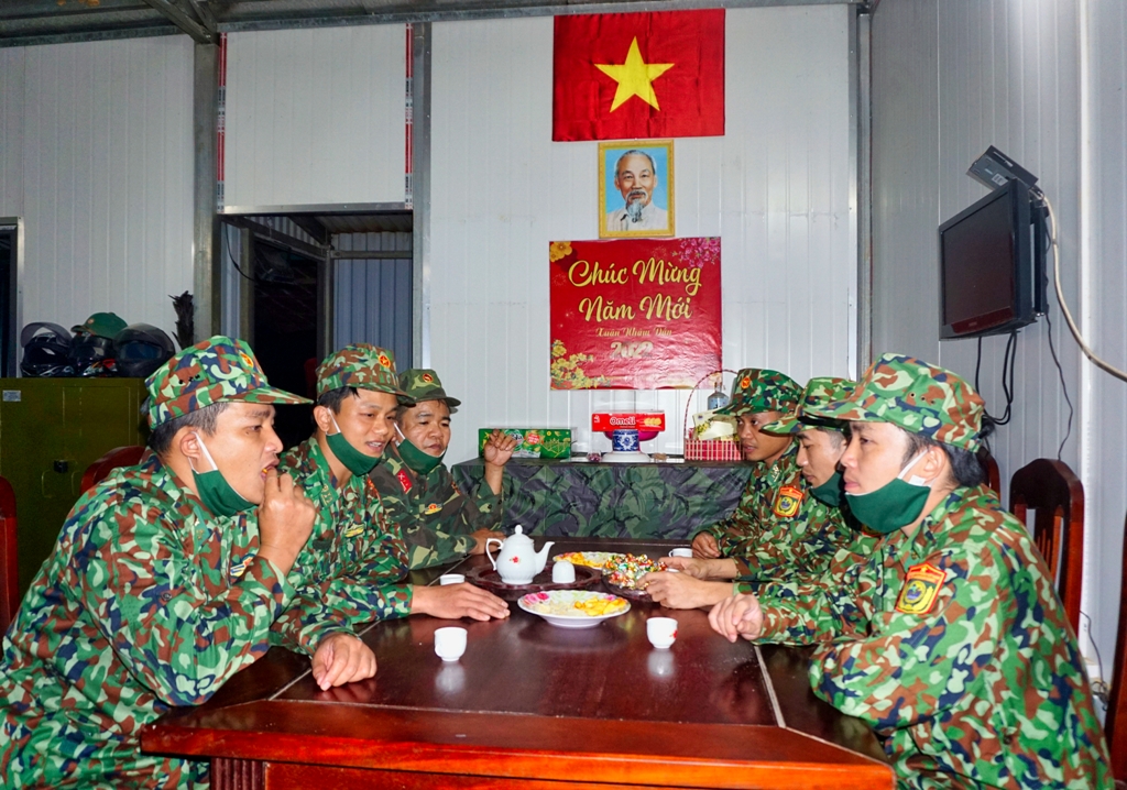 Sau giờ tuần tra, các cán bộ, chiến sĩ sum vầy đón tết, động viên nhau cố gắng