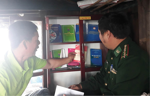 Rất nhiều quyển sách như: “Bộ luật Hàng hải Việt Nam”, “Hỏi đáp về pháp luật về biển”, tờ rơi về biển, đảo Việt Nam… được sắp xếp ngăn nắp trong chiếc tủ gỗ áp chắc chắn vào thân tàu ở vị trí thuận lợi. Đây là “Tủ sách pháp luật” do Bộ Chỉ huy BĐBP tỉnh trang bị. Anh Tài cho biết: Không chỉ trong thời gian rảnh rỗi khi tàu nằm bờ, ngay hành trình đánh bắt trên biển, những lúc nghỉ ngơi, anh em bạn thuyền cũng đọc sách pháp luật, tờ rơi, để kiến thức thấm dần dần.