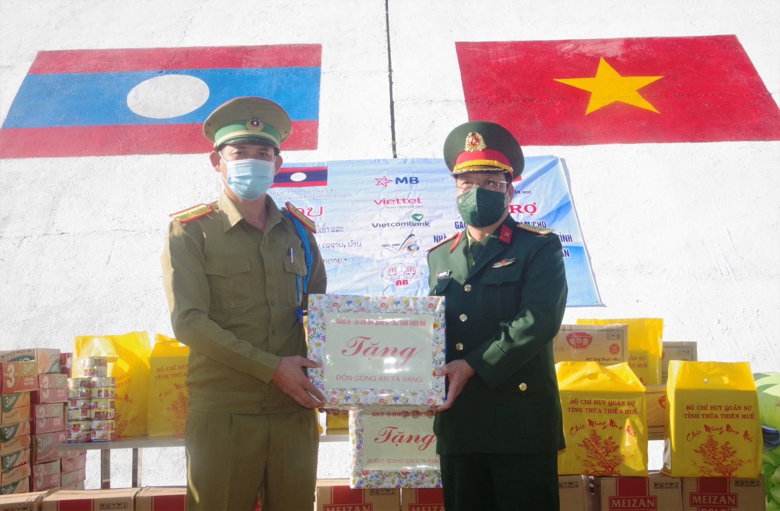 HNN.VN - Ngày 22/1, tại Cửa khẩu A Đớt, huyện A Lưới, Bộ CHQS tỉnh phối hợp với Ngân hàng Quân đội Chi nhánh Huế, Viettel Huế, Ngân hàng Vietcombank Huế và các đơn vị trao hỗ trợ gạo và nhu yếu phẩm cho 240 hộ dân thuộc các bản Xê Xáp, Ka Lô, huyện Kà Lừm, tỉnh Sê kông và Bản Cô Tài, tỉnh Salavan, Lào.