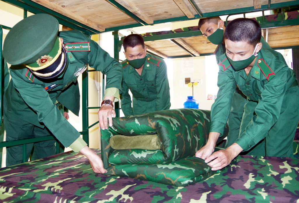 Cán bộ phụ trách hướng dẫn chiến sĩ mới làm quen với việc gấp chăn, màn
