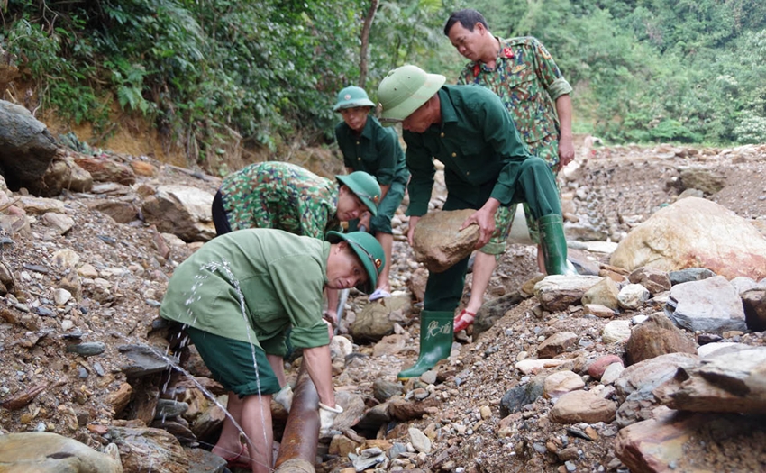 | Cán bộ, nhân viên Đoàn 92 bắt nước sạch về cho bà con thôn Liên Hiệp, xã Lâm Đớt, huyện A Lưới |
