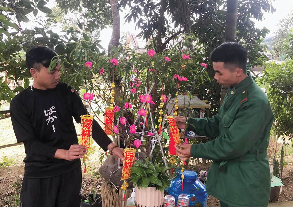 Thượng tá Hồ Ngọc Tuấn, Đồn trưởng Đồn BPCK Hồng Vân và Thượng tá Nguyễn Đức Hạnh, Chính trị viên Đồn Biên phòng Nhâm chia sẻ, mỗi mùa tết đến, những người lính ở lại với biên cương, phải “chân cứng đá mềm” hơn gấp nhiều lần, chấp nhận hy sinh hạnh phúc riêng tư, bình dị. “Ai cũng có cha mẹ, vợ con đang chờ đợi ở quê nhà. Quanh năm suốt tháng xa nhà, đến tết ai cũng mong ngóng được đoàn tụ cùng gia đình, đỡ đần cha già mẹ yếu, đỡ đần vợ con chuẩn bị cho tết. Cha mẹ cũng mong ngóng con, vợ ngóng chồng, con ngóng cha. Trong lúc các cặp vợ chồng đưa con vui vẻ đi sắm tết, cùng nhau gói bánh chưng, chuẩn bị lễ vật đặt lên bàn thờ tổ tiên, sum vầy trong những ngày tết, thì vợ con người lính “gồng gánh” một mình. Có trường hợp, đêm giao thừa, người vợ bầu vượt mặt, một mình vào viện sinh con, trong lúc ở biên giới người chồng đang cùng đồng đội đi tuần tra, canh giữ bản làng. Cả hai đầu nỗi nhớ đều khắc khoải. Nhưng vì nhiệm vụ, đảm bảo an ninh trật tự, chung tay chăm lo tết ấm cho người dân, vì cái tết bình yên nơi mảnh đất phên dậu của Tổ quốc, chúng tôi vẫn sẵn sàng, cha mẹ, vợ con ở hậu phương cũng chia sẻ và tự hào vì điều đó” - Thượng tá Nguyễn Đức Hạnh bày tỏ.
