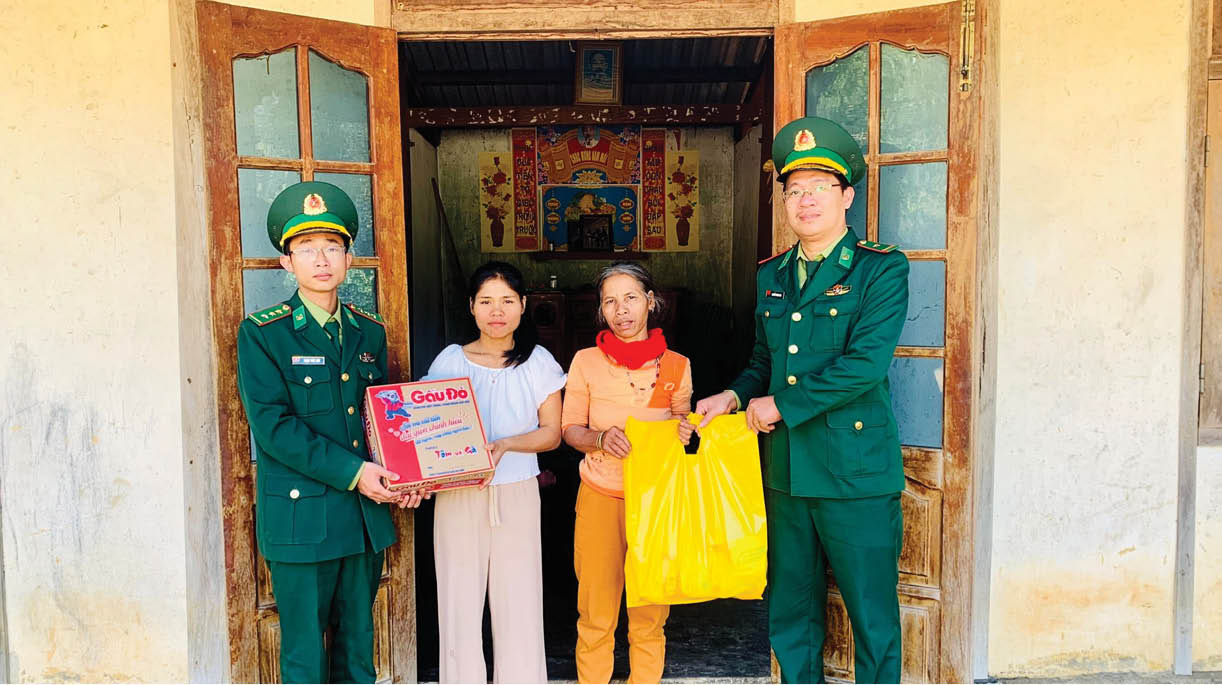 Thiếu tá Nguyễn Thanh Thái (phải) cùng đồng đội tặng quà cho người nghèo nơi biên giới