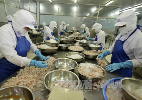 Chế biến tôm đông lạnh xuất khẩu tại Công ty Cổ phần Xuất nhập khẩu tổng hợp Giá Rai, thị xã Giá Rai (Bạc Liêu). Ảnh: Vũ Sinh/TTXVN