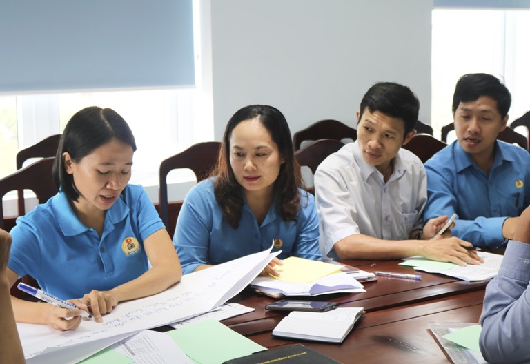 Các cán bộ công đoàn cùng chia sẻ kinh nghiệm, thảo luận theo nhóm