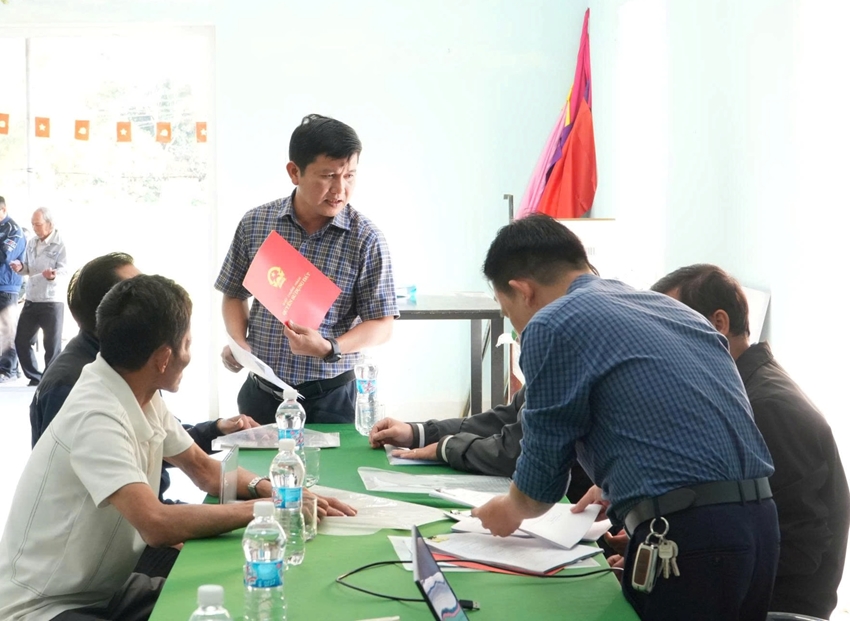 | Lãnh đạo UBND xã và tổ công tác hướng dẫn người dân về thủ tục liên quan đến đất đai |