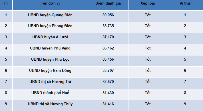 Đối với khối UBND các huyện, thị, thành phố thì UBND huyện Quảng Điền dẫn đầu với 89,056 điểm, xếp loại tốt.
