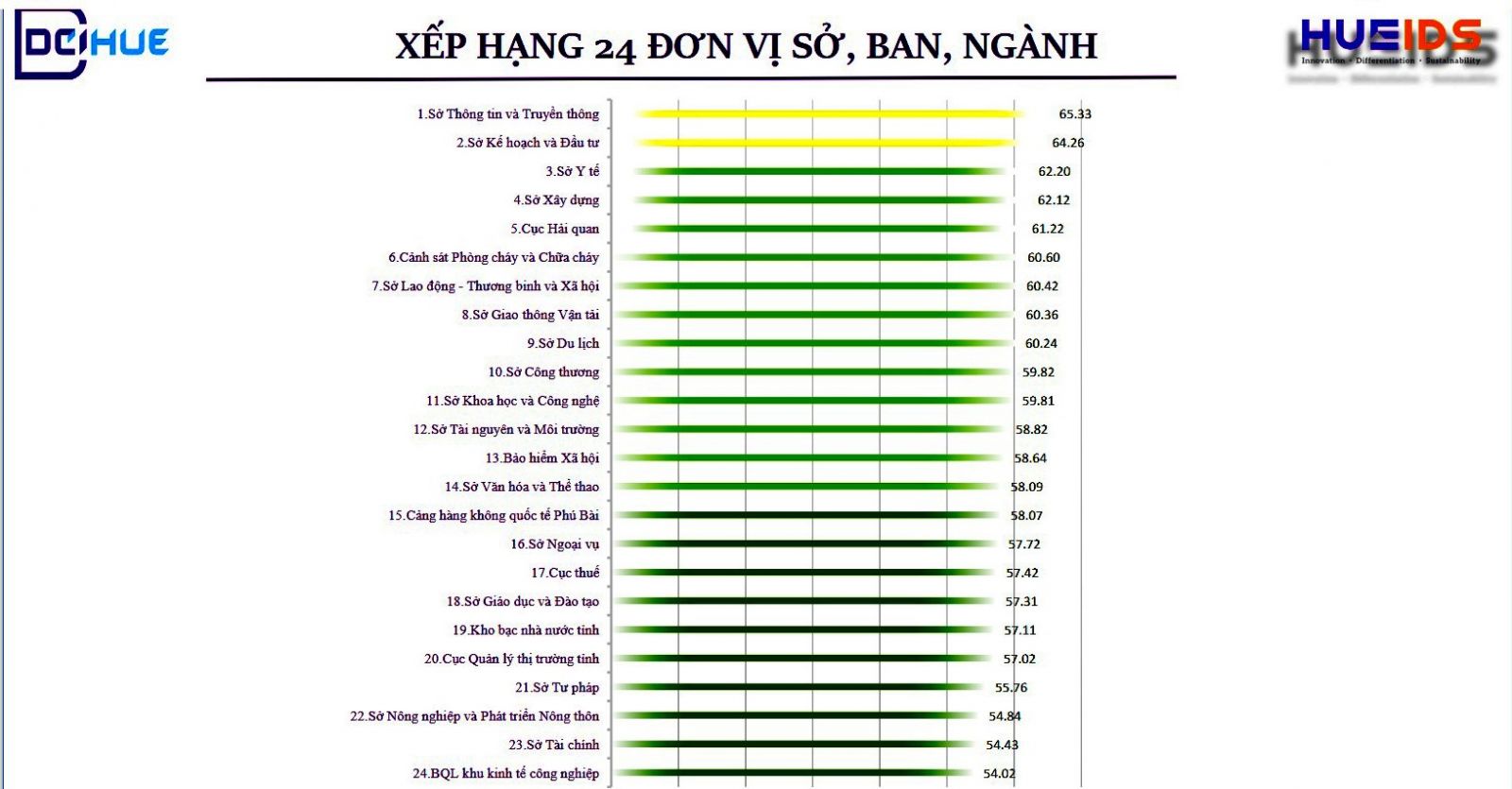 Theo đó, Sở Thông tin và Truyền thông là đơn vị dẫn đầu nhóm các sở, ban ngành với 65,33 điểm (tăng 12 bậc so với năm 2019); UBND thị xã Hương Trà dẫn đầu nhóm các địa phương với 63,10 điểm (tăng 3 bậc so với năm 2019).