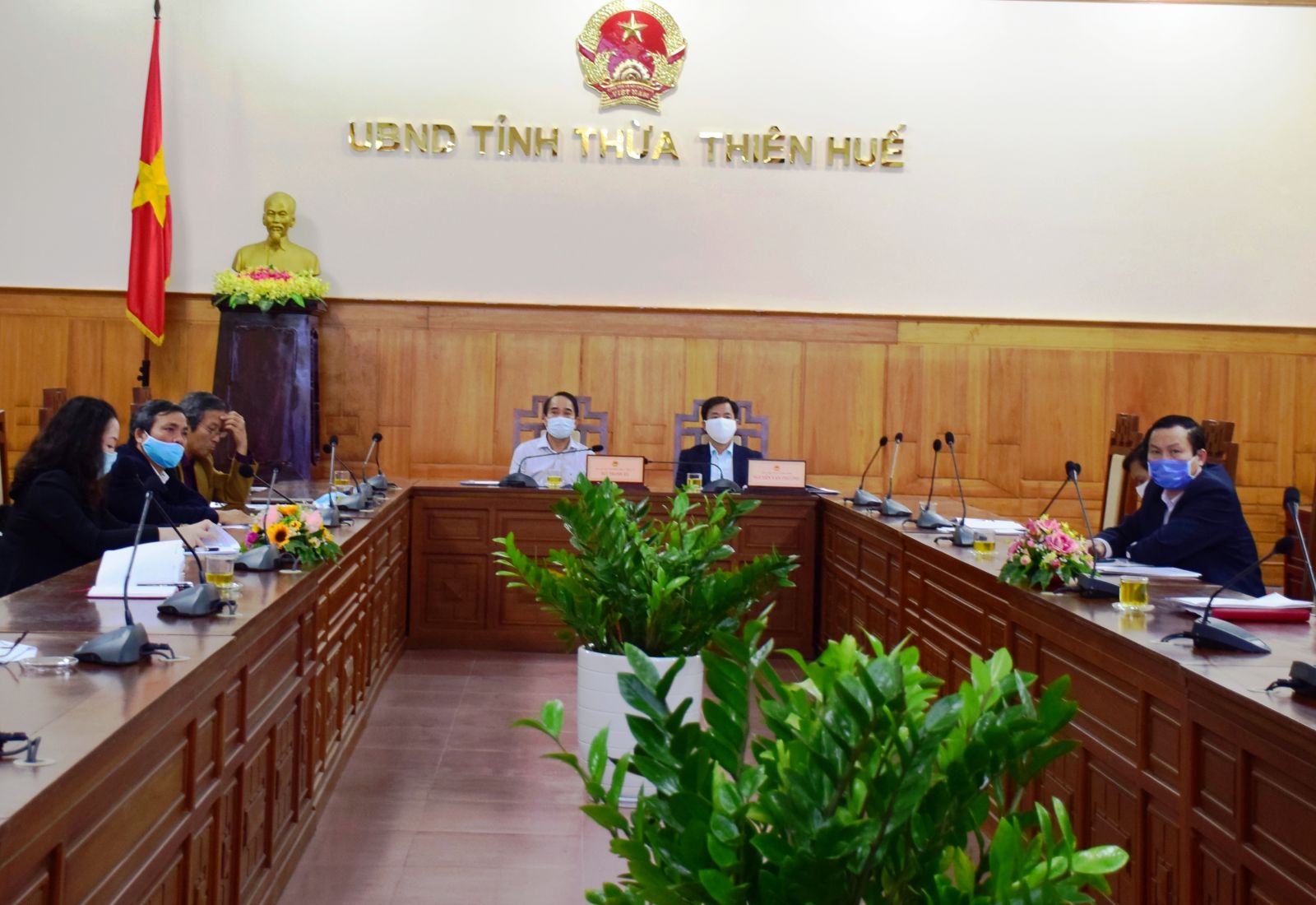 Phó Bí thư Thường trực Tỉnh ủy Bùi Thanh Hà và Phó Chủ tịch UBND tỉnh Nguyễn Văn Phương tại điểm cầu Thừa Thiên Huế