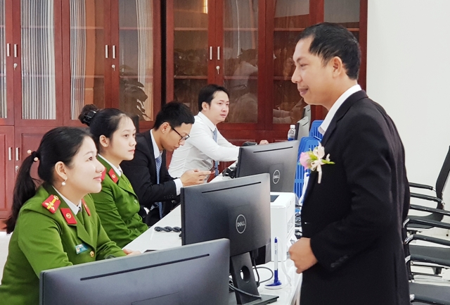 Giám đốc Trung tâm Hành chính công tỉnh Trần Thị Hoài Trâm giới thiệu một số phần mềm tại trung tâm