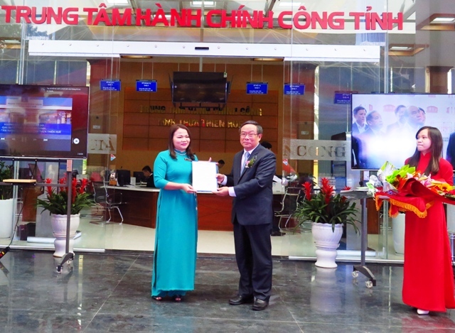 Chủ tịch UBND tỉnh nguyễn Văn Cao trao quyết định bổ nhiệm Giám đốc Trung tâm Hành chính công tỉnh cho bà Trần Thị Hoài Trâm