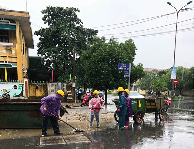Công nhân Công ty CP Môi trường và Công trình đô thị Huế dọn dẹp vệ sinh trước bão số 9. Ảnh: LINH ĐAN