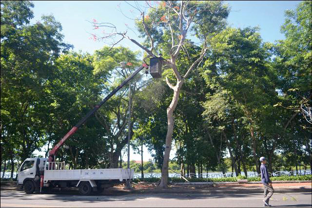 Đường Lê Duẩn và Phạm Văn Đồng là hai tuyến đầu tiên được chọn để tiến hành cắt tỉa cành, hạ độ cao các cây phượng vỹ trong sáng 14/6.