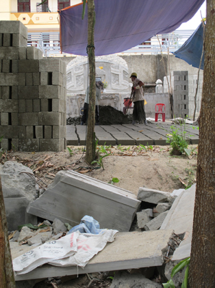 Theo chân ông Nguyễn Đắc Diên, Phó Phổ Vĩnh Nghĩa, chúng tôi có mặt tại hiện trường. Đúng là có chuyện xây dựng cổng lăng mộ bị phá dỡ. Ông Diên nói: “Lẽ ra, trước khi phá dỡ, phường phải thông báo hoặc yêu cầu chúng tôi viết cam kết: nếu bị giải toả để mở rộng đường hoặc xây dựng hệ thống thoát nước thì sẽ không đền bù”.